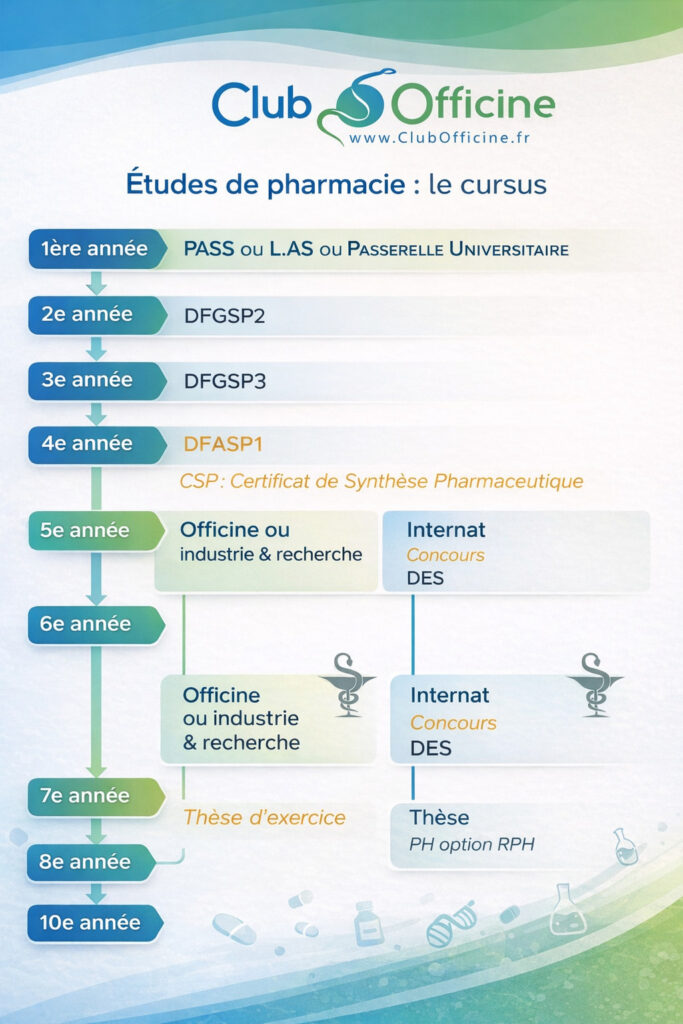 | Officine | 1 an (6e année) | Préparer à l’exercice en pharmacie d’officine | Pharmacien adjoint, pharmacien titulaire (sous conditions d’installation) | Comprend une formation professionnalisante et un stage de pratique officinale de 6 mois |